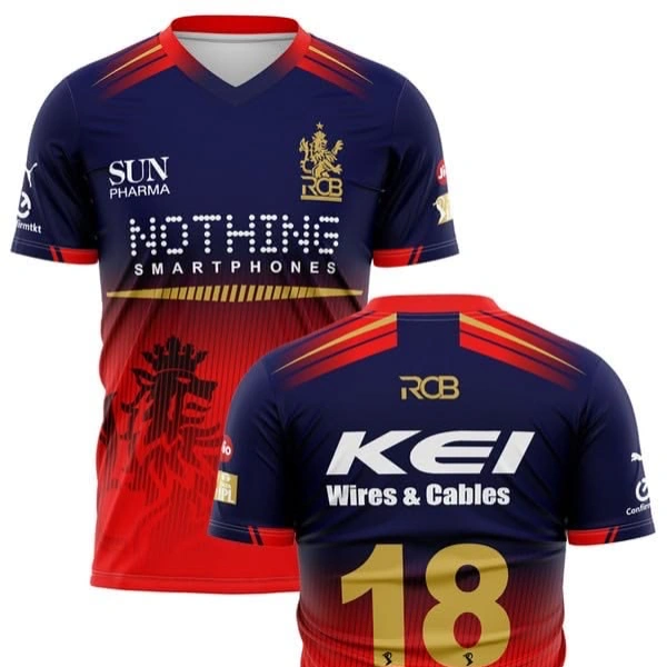 RCB IPL jersey available in Nepal with star and sponsor Nothing logo print. Premium quality cricket jersey inspired by Royal Challengers Bangalore latest design. Custom name, number, and logo printing available using high-quality sublimation technology. Ideal for cricket fans, clubs, tournaments, and sports shops in Nepal looking for stylish RCB jerseys with professional finishing and long-lasting color.